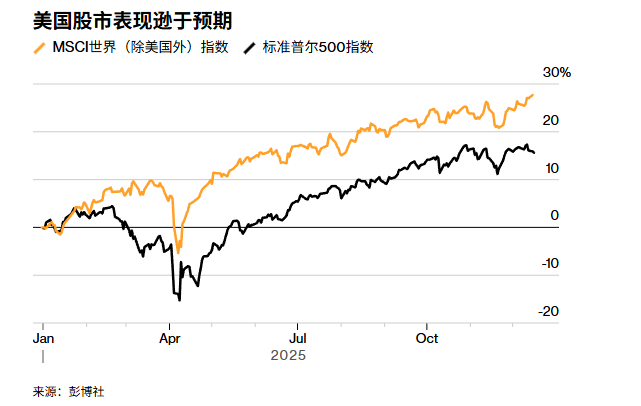 数据显示,剔除美国公司后的MSCI全球指数(MSCI ex-US index)全年上涨约29%,大幅领先标普500指数16%的涨幅,这是自2009年以来两者最大的差距。