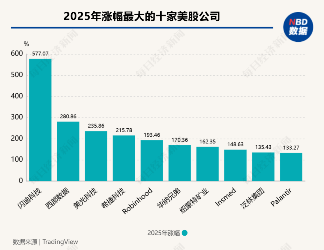 从涨幅排名前十的美股公司的表现来看,受益于AI数据中心建设热潮,存储企业表现强劲,包揽前四。其中,闪迪科技(SanDisk)全年上涨577%,排名第一。排在其后的三家公司的年涨幅也都超过200%。
