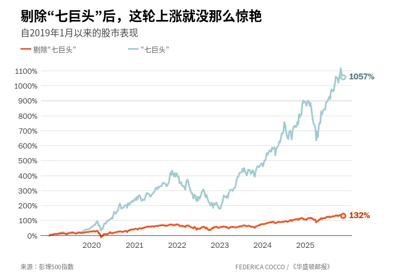 从数据上看,2025年标普500指数的涨幅中,有高达45%由“七巨头”贡献。若将时间线进一步拉长,不难发现,自2019年以来,“七巨头”上涨了1057%,而剔除“七巨头”的标普493股票仅上涨132%。